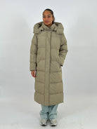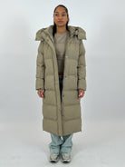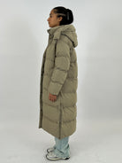 Wij houden van de oversized puffer coat trend. Deze variant is extra lang en heeft ritsen aan de zijkanten, welke ook open kunnen. De jas heeft een capuchon die er ook af kan met een rits.