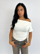 Hoe leuk is deze offshoulder snatched top?! Deze is gemaakt van een zachte stretch stof en zit heerlijk comfy.