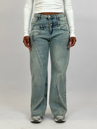 de jeans valt op maat. Het model is 175 en draagt maat L.