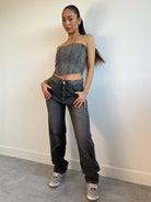 Hoe mooi is deze maison jeans met rhinestones op de zak?! De jeans heeft een baggy fit en valt op maat.