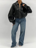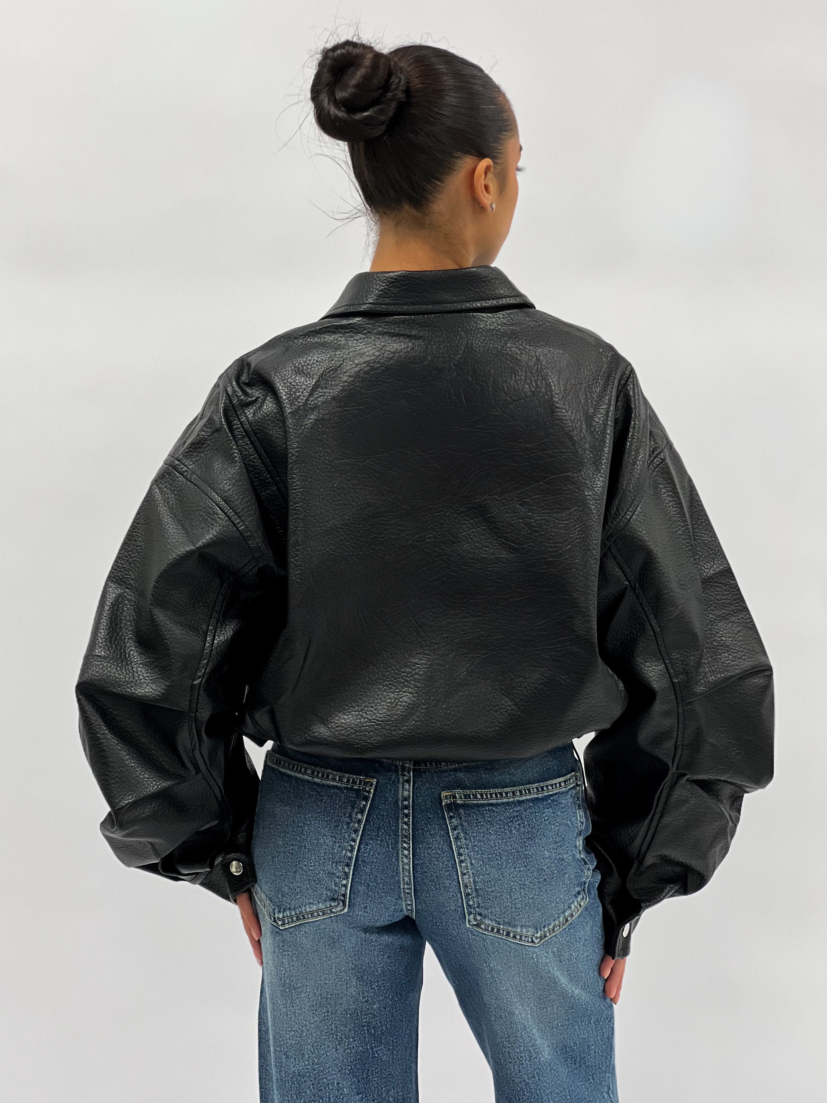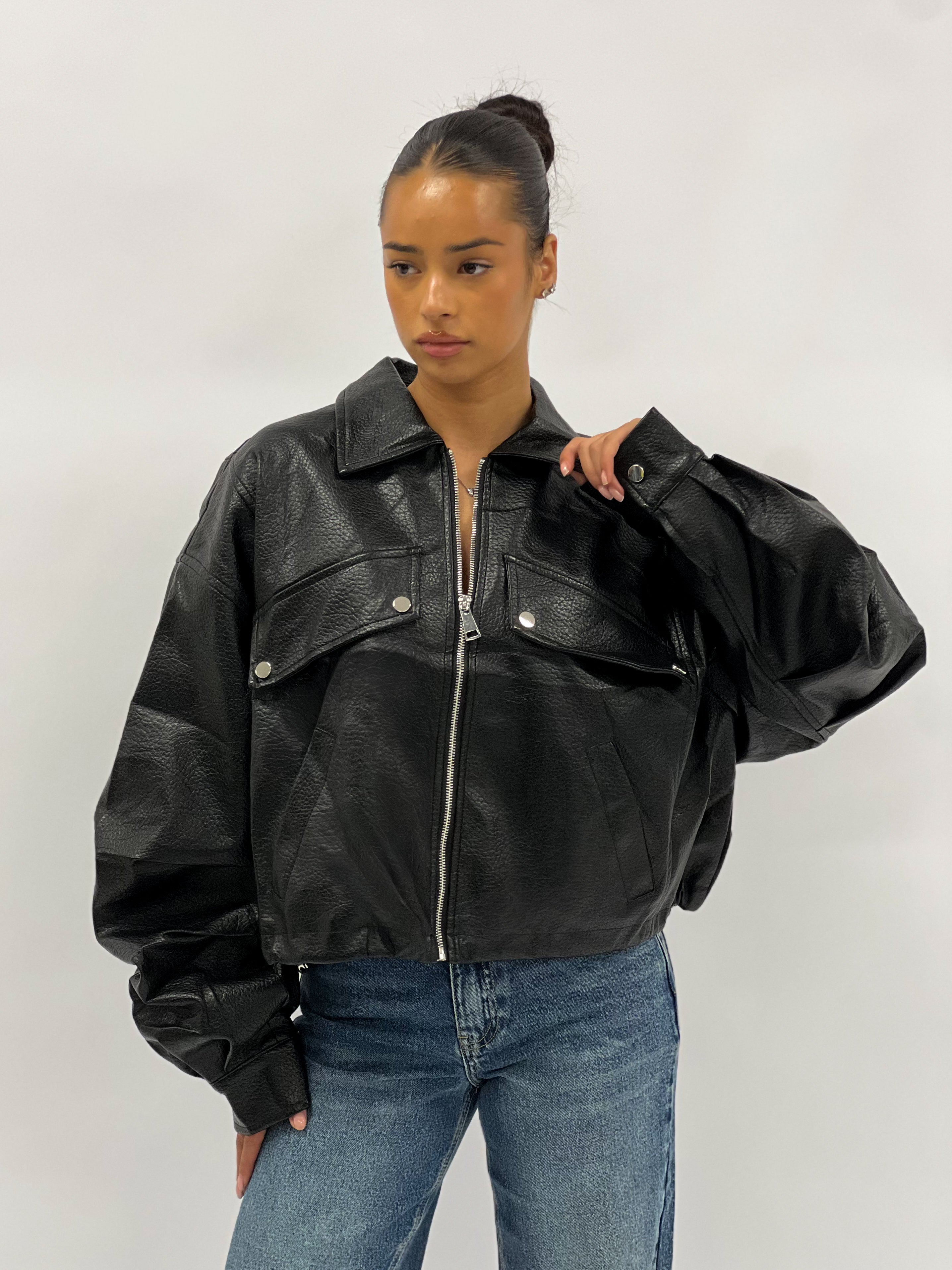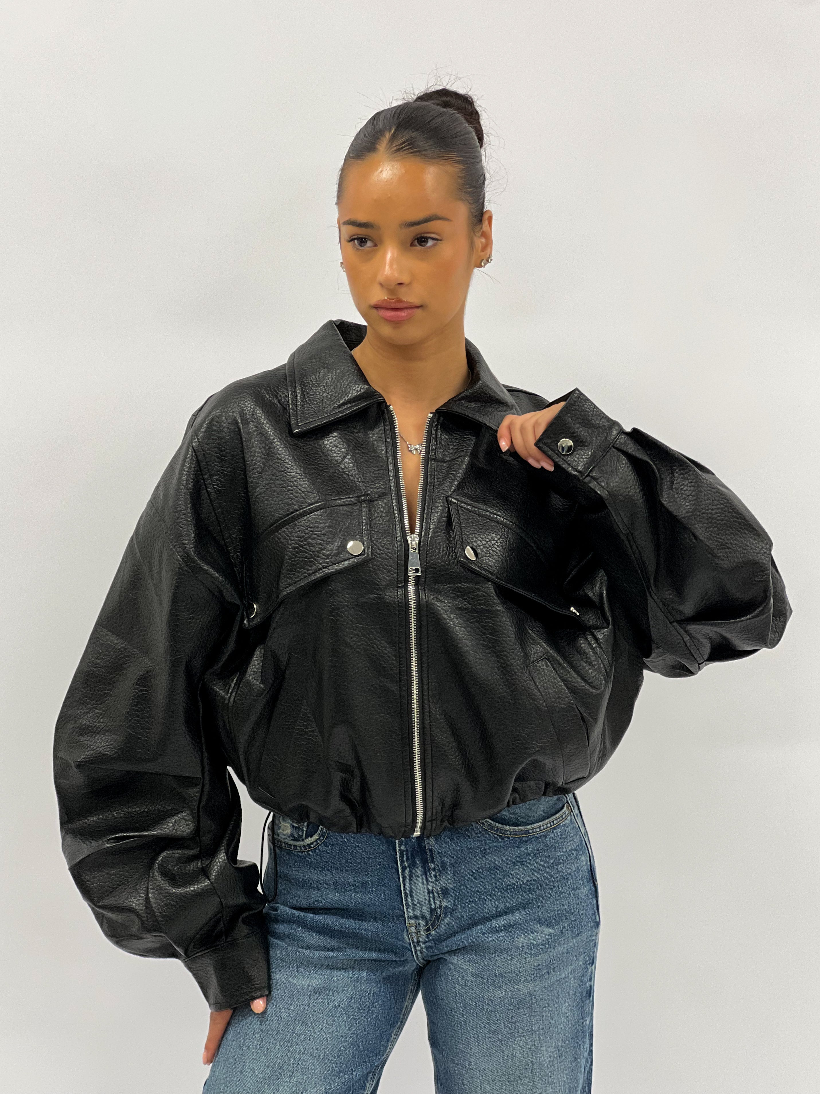 Hoe leuk is deze leatherlook bomberjacket?! Deze heeft touwtjes in de taille, waardoor je hem puffy of getailleerd kan dragen.