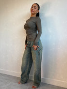 De jeans valt op maat. Het model is 163 en draagt maat XS.